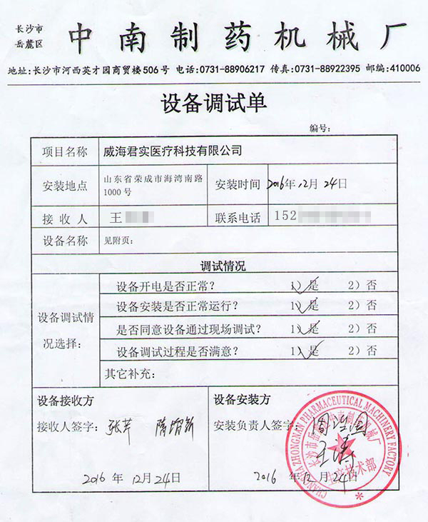 威海海洋職業(yè)學(xué)院經(jīng)過(guò)全面考察對(duì)比,最終選擇了我廠生產(chǎn)的成套制藥設(shè)備生產(chǎn)線,包括:片劑設(shè)備、全自動(dòng)膠囊填充機(jī)、顆粒粉劑設(shè)備、口服液制劑設(shè)備等27種制藥設(shè)備,2016年12月24日經(jīng)過(guò)我廠專業(yè)技術(shù)人員上門安裝調(diào)試,全套設(shè)備生產(chǎn)線全面調(diào)試安裝驗(yàn)收完成,客戶對(duì)我們的專業(yè)服務(wù)給予了高度評(píng)價(jià)。