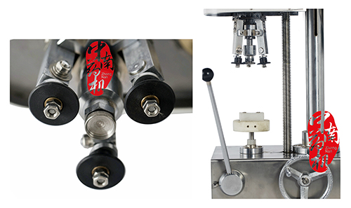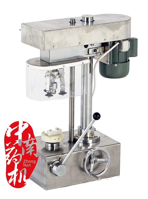 該機(jī)為臺(tái)式三刀旋風(fēng)軋蓋機(jī),臺(tái)面用不銹鋼板全包,整潔耐腐蝕易清掃,軋蓋刀頭系用優(yōu)質(zhì)鋼材加工,表面淬火處理,經(jīng)久耐用。工作時(shí),被軋蓋瓶子不轉(zhuǎn),均布120°三只旋風(fēng)刀旋轉(zhuǎn)軋蓋封口,刀柄設(shè)計(jì)為彈簧結(jié)構(gòu),三刀的距離可以微調(diào),適應(yīng)性強(qiáng),軋蓋成品率高,馬達(dá)罩也選用不銹鋼罩。本機(jī)是部隊(duì)、醫(yī)院、化驗(yàn)室、小型制藥廠的選擇。
