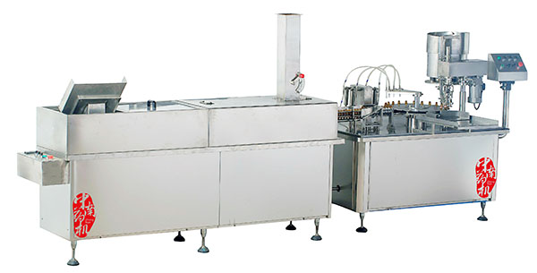 瓶子經(jīng)自來水(或回用水)及去離子水內(nèi)外沖洗,再由凈化壓縮空氣吹去表面的水珠,然后進入烘干段烘干。瓶子出烘箱,進入灌封機進行灌裝軋蓋??膳c燈檢機,貼標(biāo)機等設(shè)備連線。符合GMP要求。