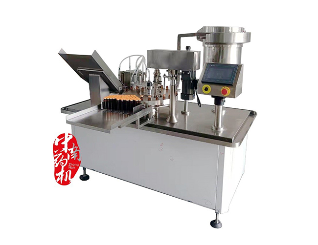 本機(jī)是口服液生產(chǎn)線中的灌裝主機(jī),主要用于對10~20ml易拉蓋(或鋁塑蓋)直管瓶的灌裝、上蓋、封口。釆用螺桿進(jìn)瓶,送瓶可靠,四頭局部跟蹤灌裝,不易產(chǎn)生泡沫;電磁振蕩送蓋,上蓋率高;三刀離心式軋蓋,軋口美觀。該機(jī)灌裝封口合二為一,結(jié)構(gòu)緊湊。