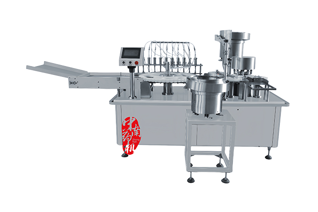 本機為西林瓶液體灌裝線的主機,具有自動進瓶、8頭灌裝、自動供塞、10頭自動真空吸塞和壓塞等功能。灌裝為蠕動泵,裝量在觸摸屏上調(diào)整,計量精確;10頭吸塞上塞,上塞可靠;灌裝和壓塞都有撥盤定位機構(gòu),保證了灌裝和壓塞的準(zhǔn)確率。